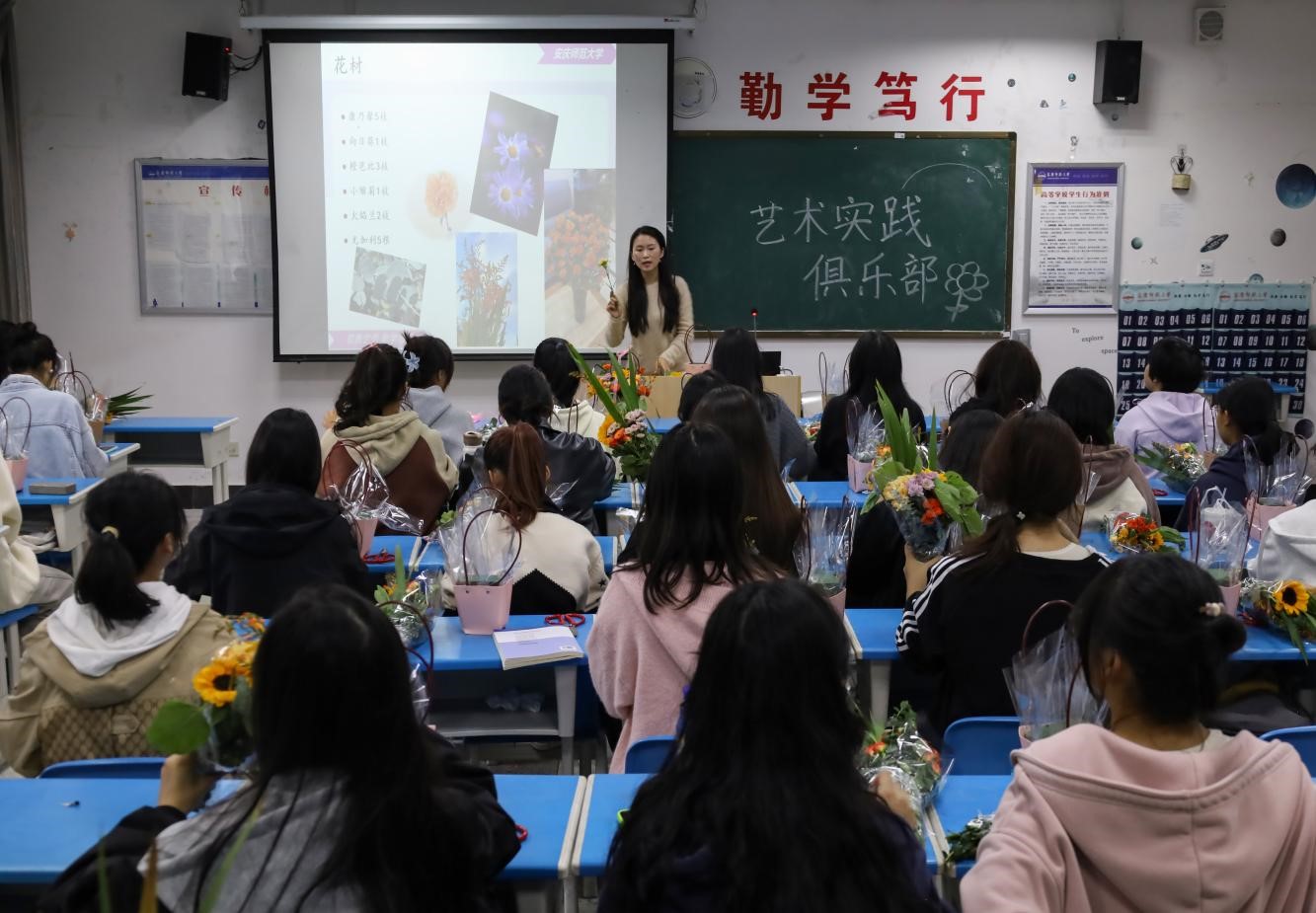挑选绚丽的花朵、修剪多余的枝桠、将花分层次插入花篮中……11月1日,太阳成tyc122cc集团艺术实践俱乐部在F203举办了一场花艺实训教学课程。俱乐部指导教师钱亚林进行教学,俱乐部全体成员参加。