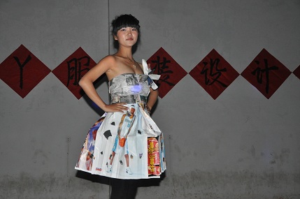 会场洋溢着热烈的气氛,参赛选手以饱满的热情和大胆的创意将自己的才华投入到决赛当中。服装材质有蚊帐、报纸、卫生纸、塑料袋等等,经过制作之后成为漂亮的服装模特和设计师为大家展示服装和设计、环保理念。设计感十足的服装和精彩的走秀,赢得了现场观众的阵阵掌声。14号名为“夜行”的裹胸晚礼服一出场就引起观众的惊呼,礼服以黑色塑料袋为主要材料,蓬起来的裙摆则巧妙的利用了蚊帐、筷子、硬纸板和黑色塑料袋做成的精致的小礼帽,时尚华美的晚礼服,再配上模特高贵冷艳的气质,赢得了评委和观众的一致好评。