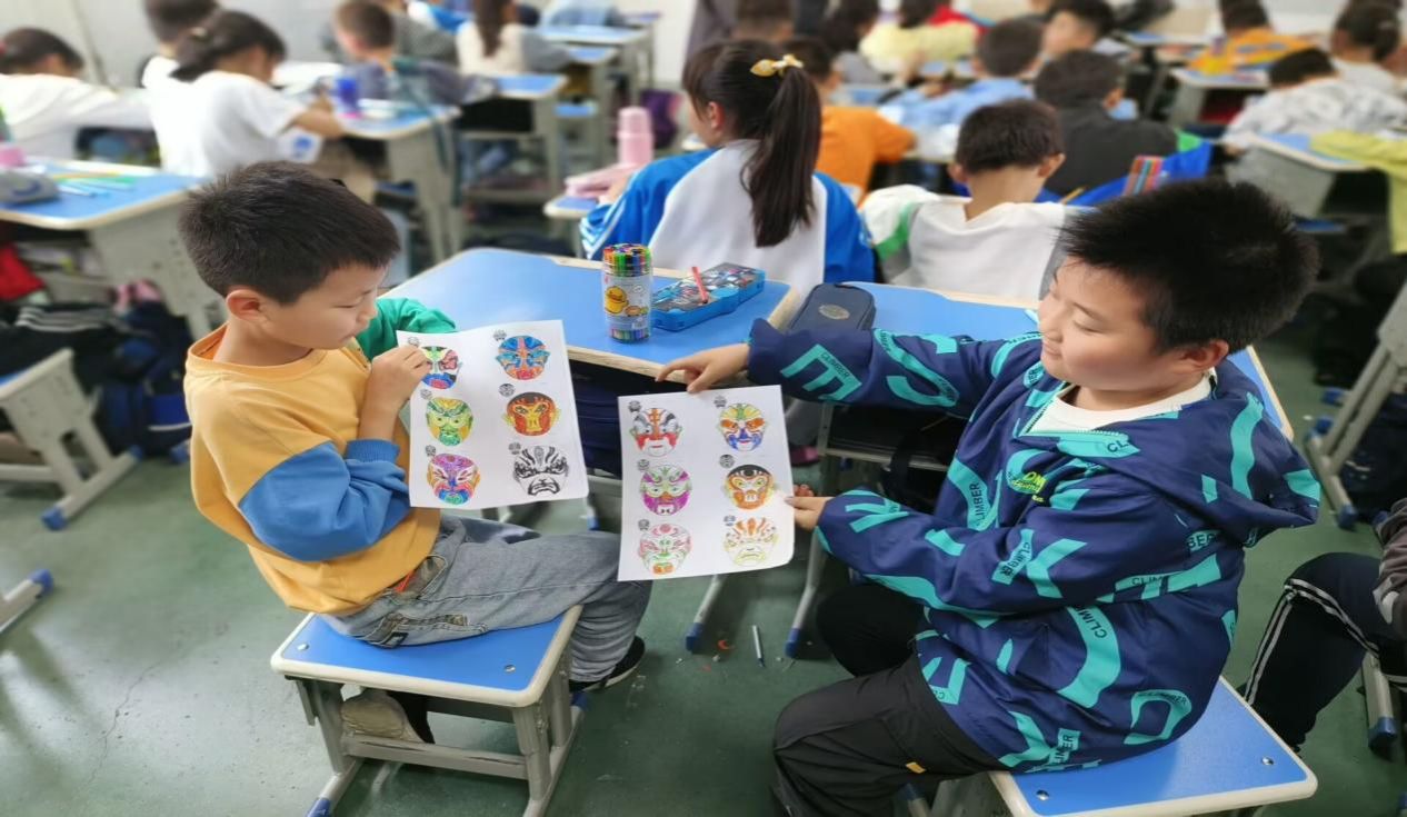 为了进一步推广非物质文化保护和传承教育,志愿者组织同学对京剧脸谱进行上色,这不单单是简单的添彩加色,更是对孩子艺术创新的激发和促进。在艺术的创作中,大家都对非遗传承的含义有了更深的体会。画纸上的鲜艳面谱阐述着同学们对国粹的热爱与守护,绘画结束后,他们纷纷向志愿者展示自己的画作,脸上洋溢着幸福与欢乐。“心灵手巧的剪纸艺术、惟妙惟肖的皮影戏法、余音绕梁的京剧粹演、锣鼓喧天的舞狮表演……”一部部国粹的精彩演示视频应接不暇,瞬间吸引了大家的注意力。在主讲人绘声绘色的讲解下,同学们对这些经典国粹有了初步的了解。随后,主讲人又对这些非物质文化遗产展开了系统的介绍。“我们要传承上一代非遗工匠的手法和精神,不能让它流失在了我们这里。”宋宜啸小朋友有感而发。