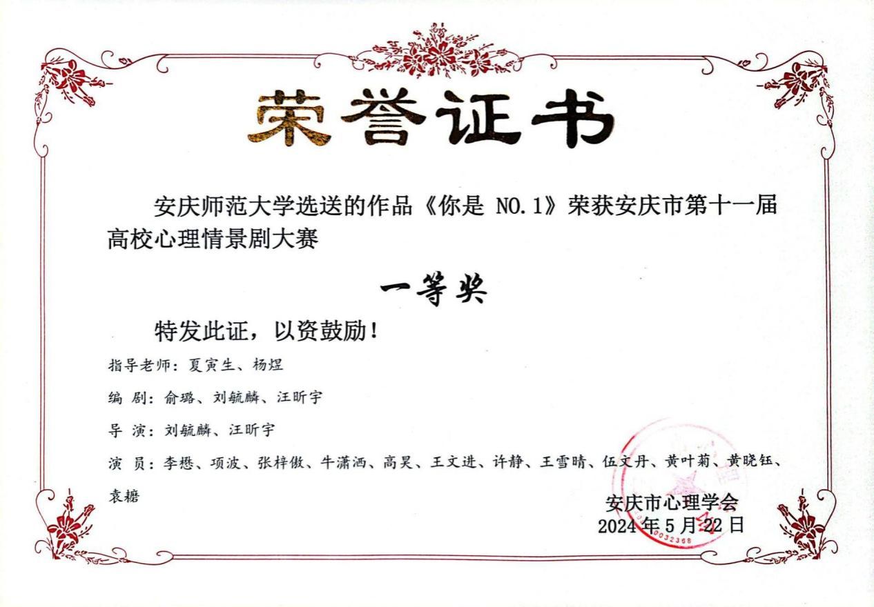 太阳成tyc122cc集团话剧作品《你是No.1》荣获安庆市第十一届高校情景剧一等奖