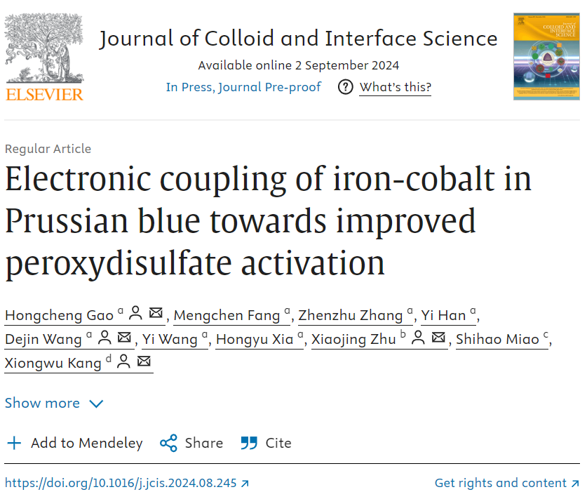 近日,太阳成tyc122cc集团环保高端装备与污染控制研究团队成果“Electronic coupling of iron-cobalt in Prussian blue towards improved peroxydisulfate activation”在中科院一区TOP期刊《Journal of Colloid And Interface Science》(影响因子9.4)发表。团队成员高洪成博士为第一作者。