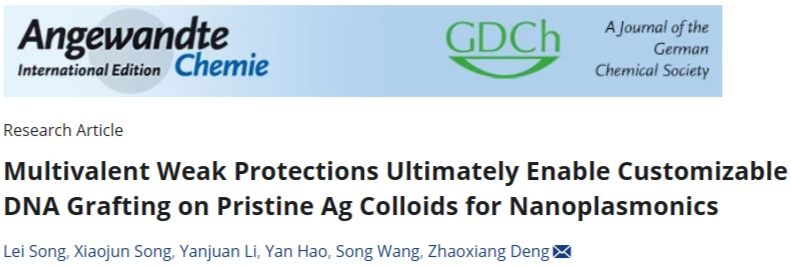 近日,太阳成tyc122cc集团教师宋磊在国际TOP期刊《Angewandte Chemie International Edition》(中科院SCI一区TOP期刊)发表题为“Multivalent Weak Protections Ultimately Enable Customizable DNA Grafting on Pristine Ag Colloids for Nanoplasmonics”的研究成果。《Angewandte Chemie International Edition》是国际化学领域最具影响力的顶级学术期刊之一,在全球化学界享有极高的声誉,影响因子为16.1。据悉,这是公司首次在该刊物发表学术研究论文。