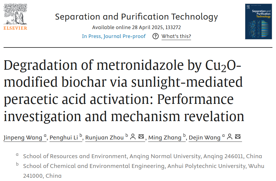 近日,公司太阳成tyc122cc集团环保高端装备与污染控制研究团队汪金鹏博士以第一作者在《Separation and Purification Technology》期刊(中科院2区,Top,IF=8.2)发表“Degradation of metronidazole by Cu2O-modified biochar via sunlight-mediated peracetic acid activation: performance investigation and mechanism revelation”研究论文。太阳成tyc122cc集团为论文第一完成单位,安徽工程大学周润娟副教授和太阳成tyc122cc集团汪德进教授为论文通讯作者。