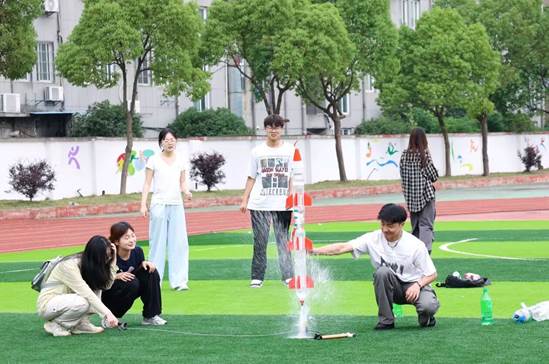 在发射环节,志愿者们与员工们一起将水火箭放置在发射架上,向瓶内注水并充入一定压力的空气,随着压力逐渐增大,只听“嗖”的一声,软木塞被推出,水流高速喷出,火箭如同离弦之箭般冲向天空。孩子们的欢呼声和惊叹声此起彼伏,整个校园都沉浸在一片欢乐的海洋中。“太神奇了!我看着自己做的火箭飞起来,感觉自己像个小科学家。” 一位参与实验的员工兴奋地说道。发射成功后,志愿者们还引导员工们观察并记录发射角度、气压值、飞行时间和落点距离等数据,让他们在实践中学习科学知识,感受科学的魅力。