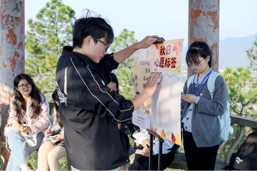 活动特别选址校园后山与文曲亭,将课堂教学延伸至自然天地,开创传统文化育人新模式。“我们想让重阳这一传统节日‘活’起来,避免它仅停留在‘敬老’的概念认知上。”活动负责人、地理科学2024(2)班的付松表示,希望通过“后山登高”这一沉浸式体验,将节日习俗与校园自然场景结合,既符合“登高祈福”的传统,又能让员工们在户外互动中切身感受节日氛围。